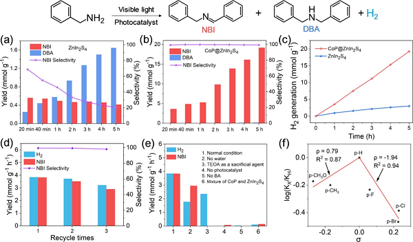 图1. NBI和DBA的时间-产率曲线,以及(a)ZnIn2S4和(b) CoP@ZnIn2S4的NBI选择性。(c) CoP@ZnIn2S4和ZnIn2S4在5小时内的H2产量。(d) CoP@ZnIn2S4每个5小时反应周期中的H2和NBI生成速率,连续三个周期。(e) CoP@ZnIn2S4在不同条件下的光催化性能。(f) 在CoP@ZnIn2S4上对于对位取代BAs的Hammett图。
