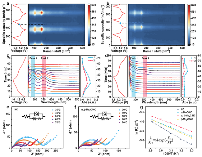 体现优异的催化活性和反应动力学。图(c)NC电极原位UV-vis光谱显示,充电过程286/350nm处I₃⁻特征峰持续增强,表明多碘化物大量溶解于电解液,反映严重的穿梭效应。图(d)α,β-MoₓC/NC电极原位UV-vis光谱显示,I₃⁻特征峰强度显著降低,证明相结对多碘化物的强锚定作用,有效抑制穿梭效应。图(e-g)的电化学阻抗与活化能结果显示,α,β-MoₓC/NC的Rct(91.6Ω)远低于NC(178.6Ω),相结的活化能仅17.4kJ/mol(NC为26.4kJ/mol),证实内置电场促进电荷转移,降低反应能垒。